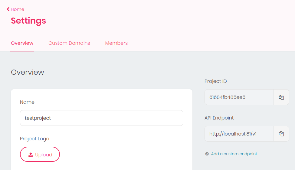 In order to connect our apps we will need the project ID and the API url. To do that we click on Settings (below the project name) and you will find the Project ID and API Endpoint on the right side: