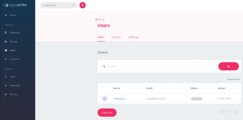 }A click on Create will create a user and the account event will print user details to the console. When you look at the Appwrite dashboard - User section you can see the new user in there too: