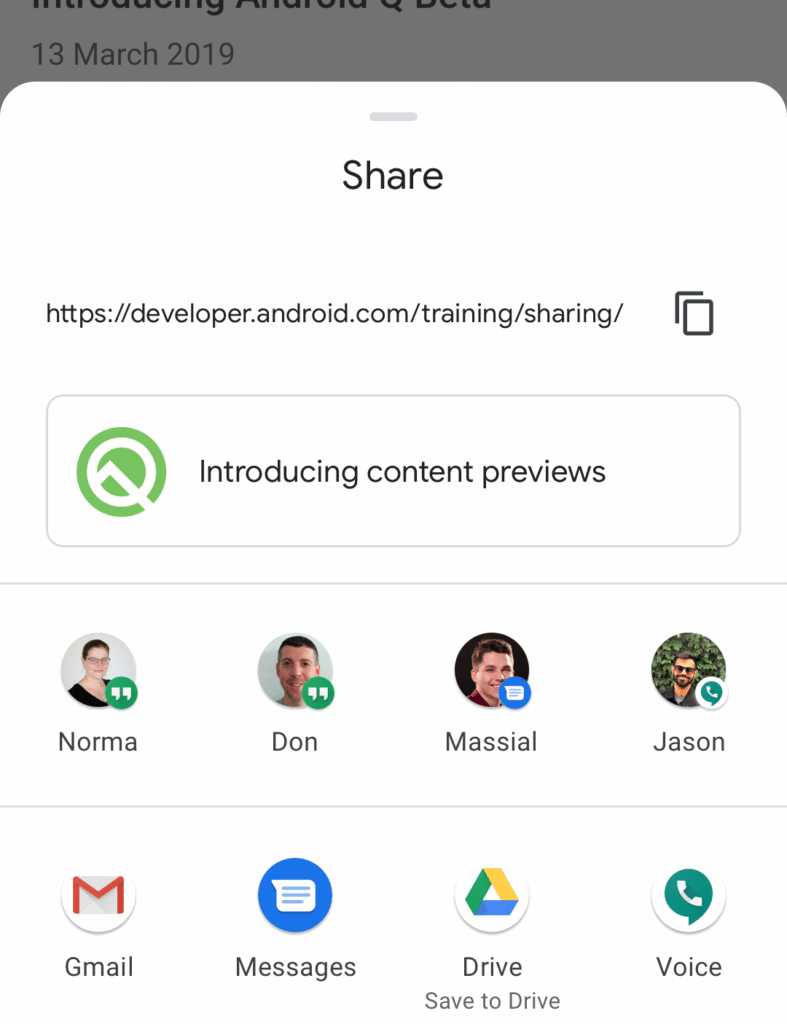 At first we will look at the Android sharing process. To send files from one app to another we can use Intents. Inside our app we start an intent with the image and the system will show you all apps that can handle images like Instagram, Mail or other installed apps. It is the default share dialog you probably have seen in other apps too: