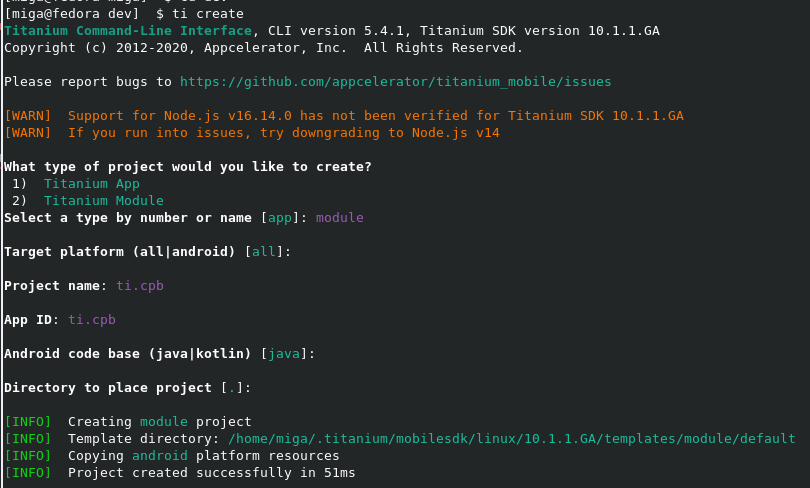 ti createand select "module", "Android" (or all) for the platform, give it a name (here ti.cpb), an app id (same ti.cpb), use java and the current folder: