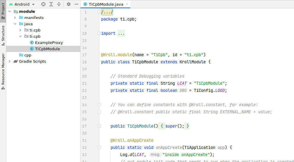 You see two files ExampleProxy and TiCpbModule in your java folder. A full description about the naming of the files is available here: https://titaniumsdk.com/guide/Titanium_SDK/Titanium_SDK_How-tos/Extending_Titanium_Mobile/Android_Module_Development_Guide/Android_Module_Architecture.html