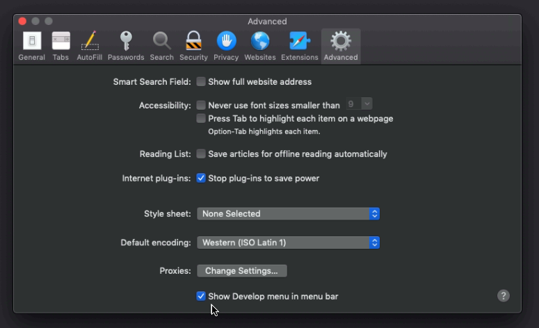 At first we will use Safari to debug the iOS WebView. In the Safari settings you will need to enable the “Developer settings” first by setting this flag: