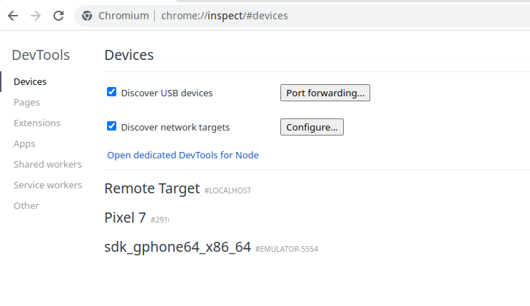 </android>This will set the app into a debug mode (make sure to remove that again for your production app!) which allows Chrome to connect to the WebView. After you open Chrome you go to chrome://inspect/#devices .