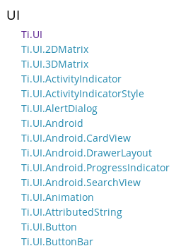 win.open();As you can see it uses the same element name e.g. "Button" and adds "create" to it, followed by ({}) where you can add the properties we will add to the TSS file later on. The Ti.UI. is the so called namespace the element is located at. The UI elements are in Ti.UI or Titanium.UI as listed in the documentation: