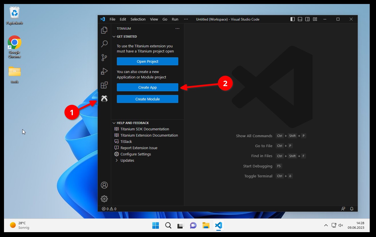 Starte VS Code einmal neu und du hast ein neues Titanium Icon (1) in der Liste. Dort findest du dann einen Button “Create App” (2) mit dem du eine neue App erstellen kannst.