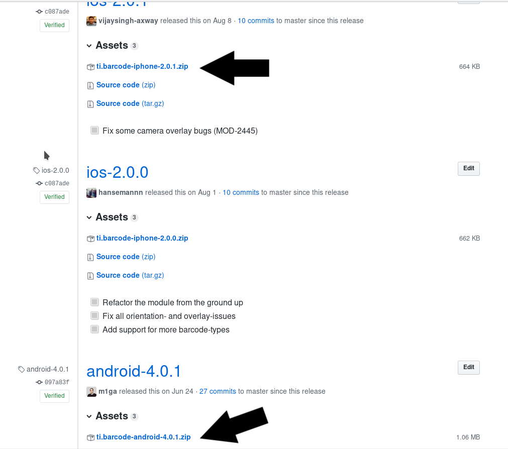 If you see a number next to “releases,” there are multiple binaries uploaded in the repository. For Ti.Barcode, you can see all the releases for iOS and Android: https://github.com/tidev/ti.barcode/releases
