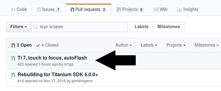 The last place to look is the “Pull request (PR)” menu or the module forks. During the update from Titanium SDK 6 to 7, you needed to update your Android modules. Some module owners aren’t active anymore or don’t have time to update these modules themselves. Luckily, some Appcelerator users fork those modules and create compatible versions or even add new features. When the repository is not active anymore, those updates won’t be included in the official page, but you still can use those new modules.