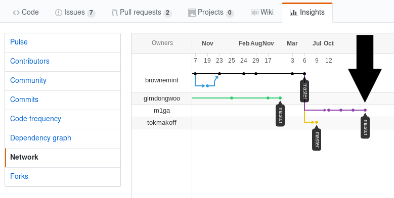 Another way to get to the file is to have a look at the forks. To do this, you need to click on “Insights – Network” and you will get a graph with all forks. Most of the time, it is the latest in the graph and you can click on that dot to go to the repository: